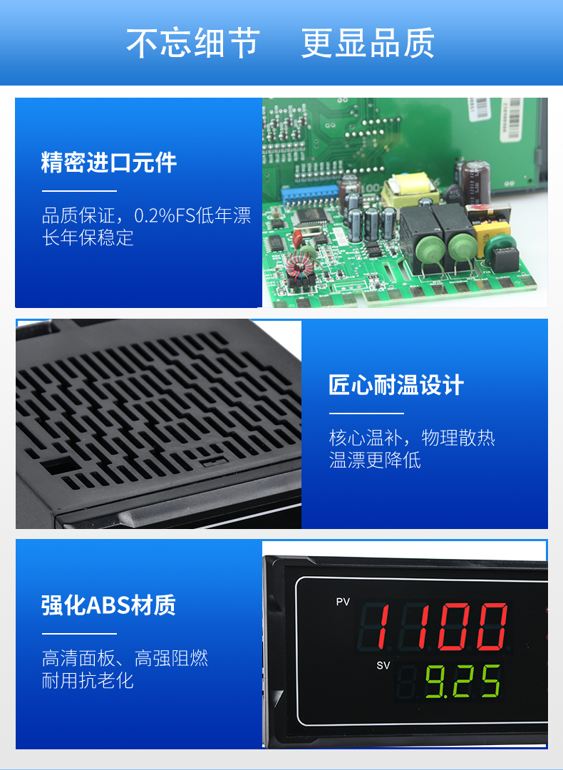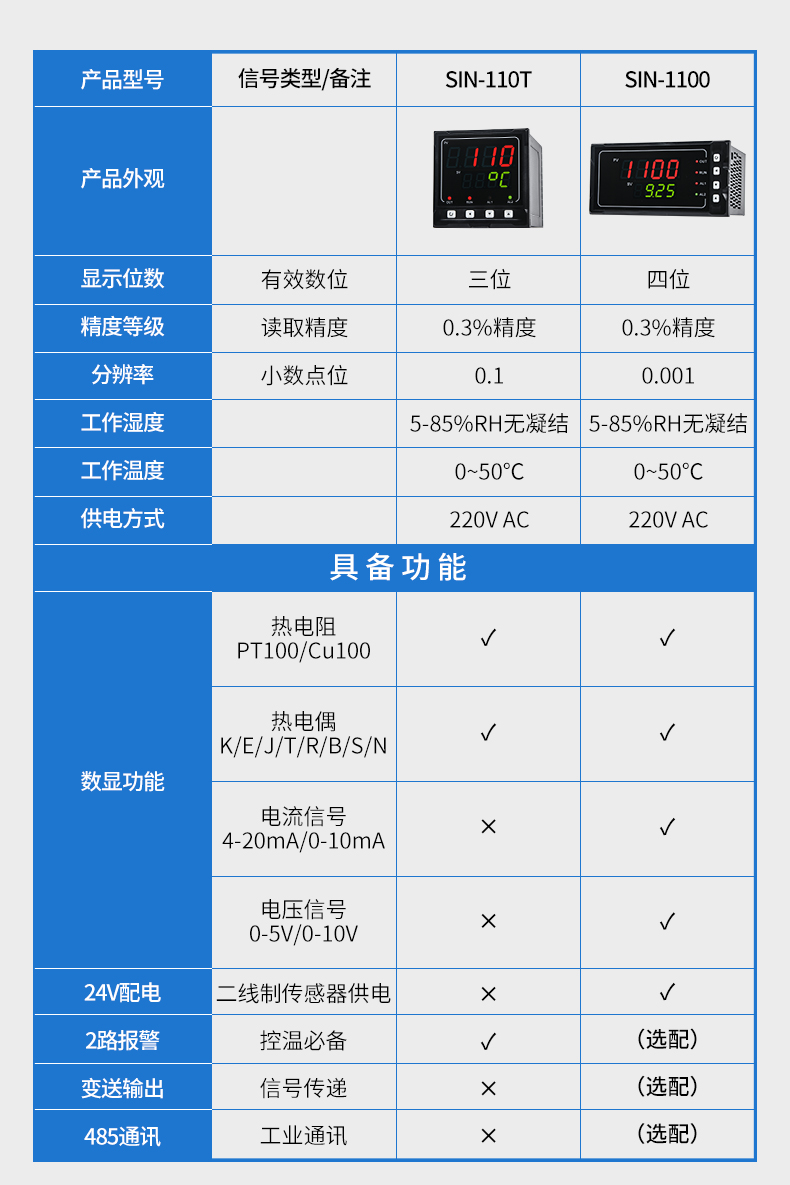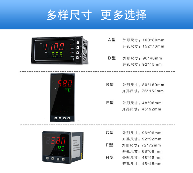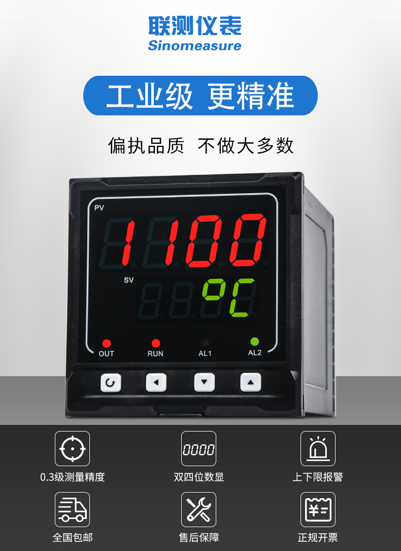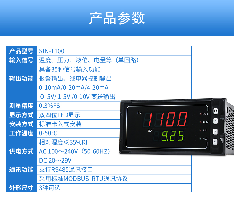 簡介:聯測SIN-1100數顯表(簡易型),傻瓜式操作,0.3級測量精度,7款外型尺寸,雙四位LED顯示,可支持熱電偶、熱電阻、電壓(可開方運算)、電流(可開方運算)及變送器輸入,適用溫度、壓力、流量、液位、濕度等工業過程量的監測。