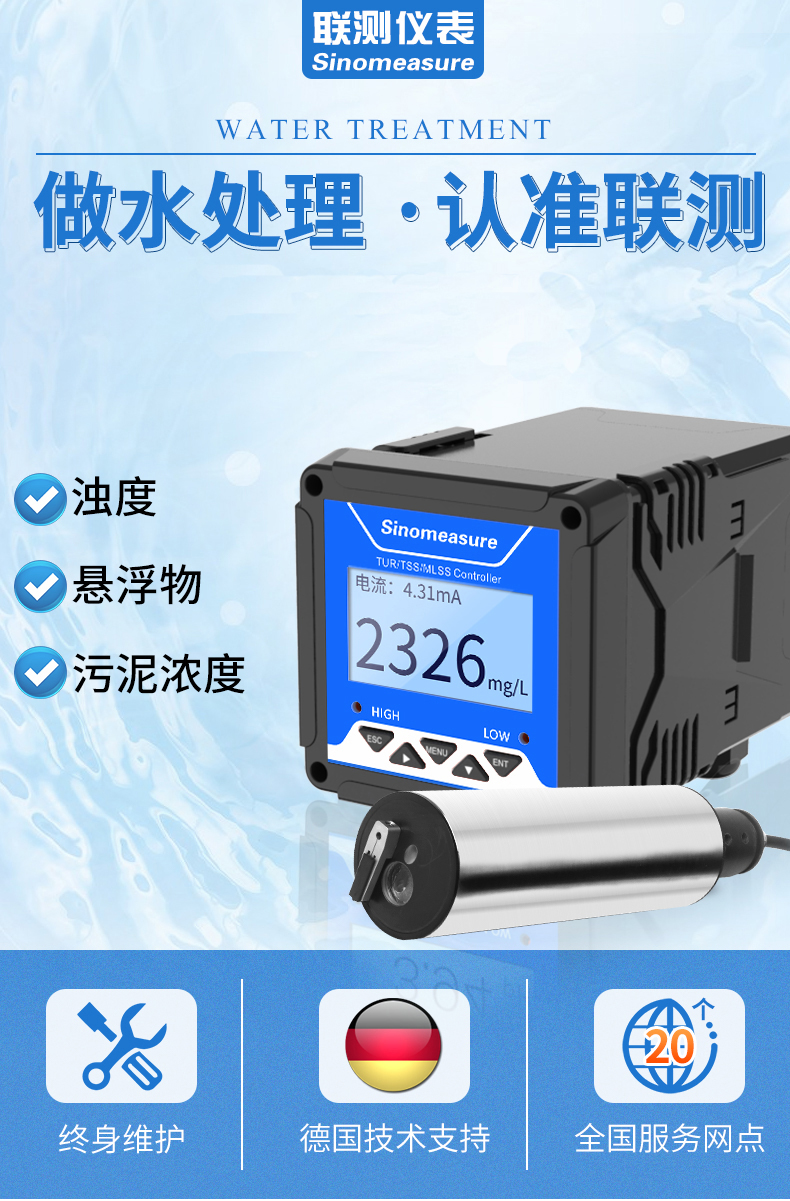 濁度/污泥濃度傳感器的原理基于組合紅外吸收散射光線法,應用 ISO7027 方法可以連續并精確地測定濁度或污泥濃度。