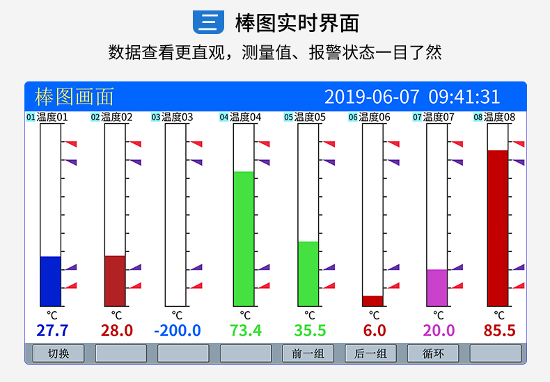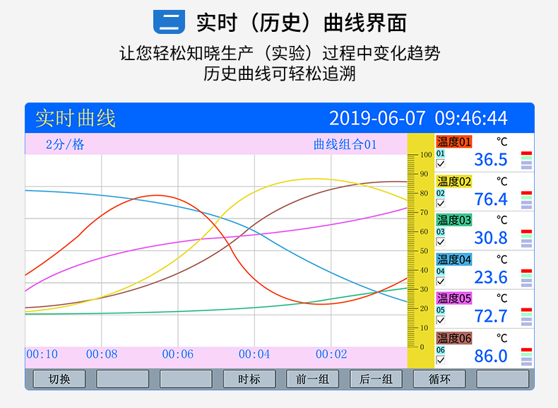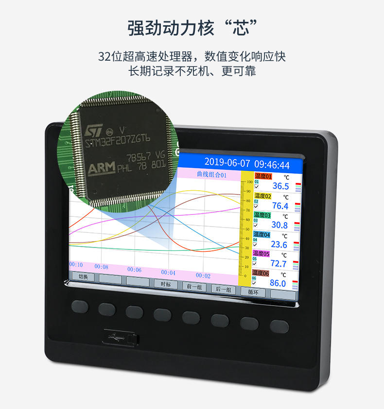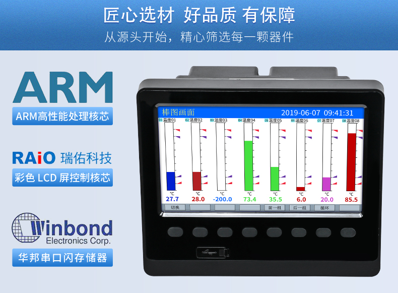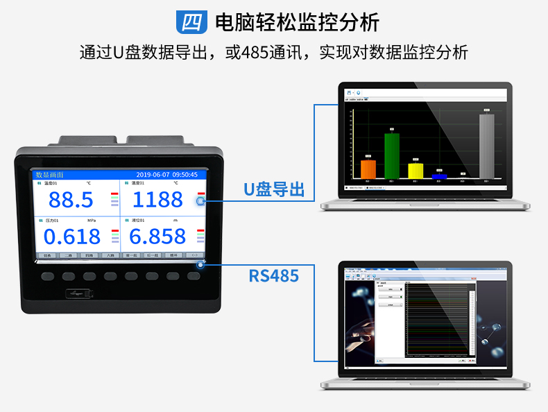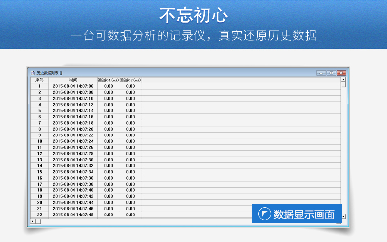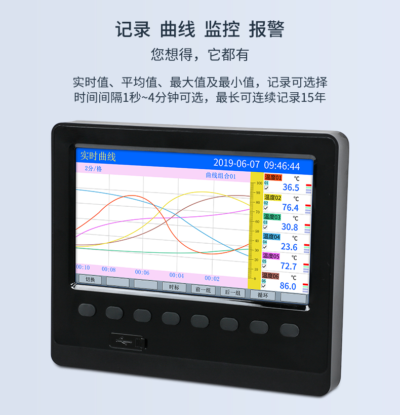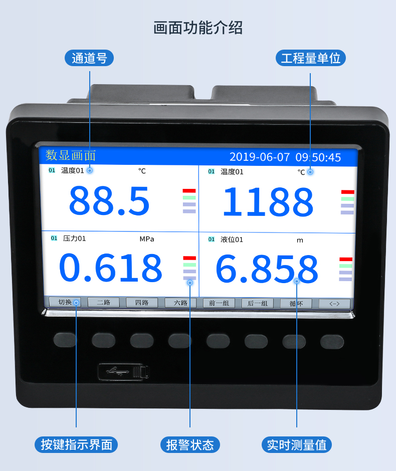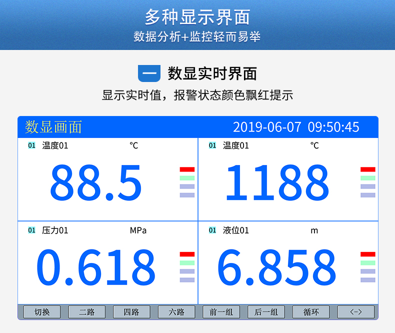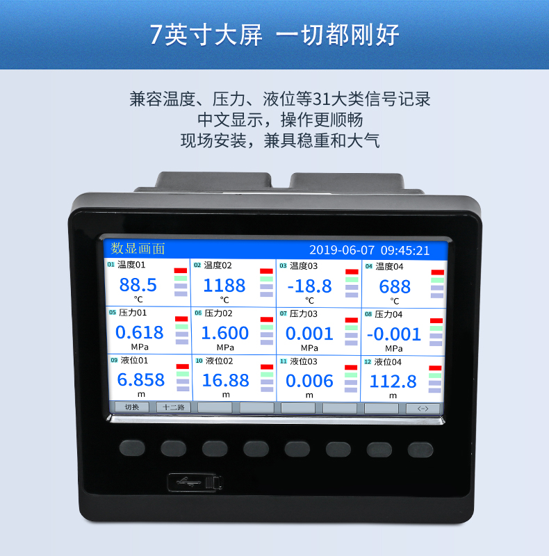 無(wú)紙記錄儀是將采集的數(shù)據(jù)/運(yùn)算數(shù)據(jù)以時(shí)間為基軸記錄在儀器內(nèi)部的存儲(chǔ)系統(tǒng)中,無(wú)消耗任何常用的記錄設(shè)施,如:紙張、筆墨。記錄在儀器內(nèi)部的存儲(chǔ)數(shù)據(jù),通過(guò)運(yùn)算、模擬后顯示在液晶屏。常用顯示用液晶屏比較廣泛。在液晶屏屏幕上,可以顯示數(shù)字顯示、棒圖顯示、曲線(xiàn)顯示、報(bào)警列表等。無(wú)紙記錄儀采集的數(shù)據(jù),常用的有:溫度、壓力、流量、液位、電壓、電流、濕度、頻率、振動(dòng)、轉(zhuǎn)速等。